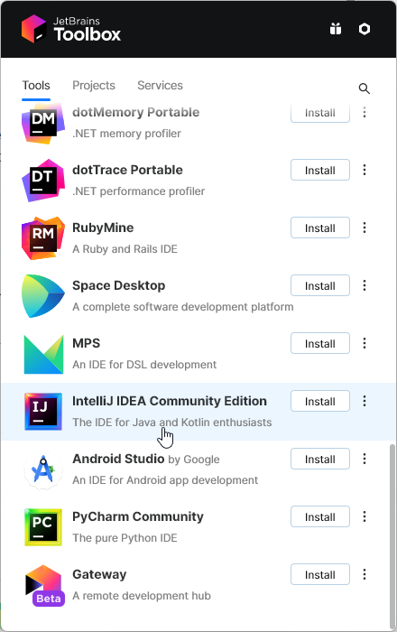 - Installeerides JetBrains Toolbox App-i ning selle abil teisi arenduskeskkondi.
