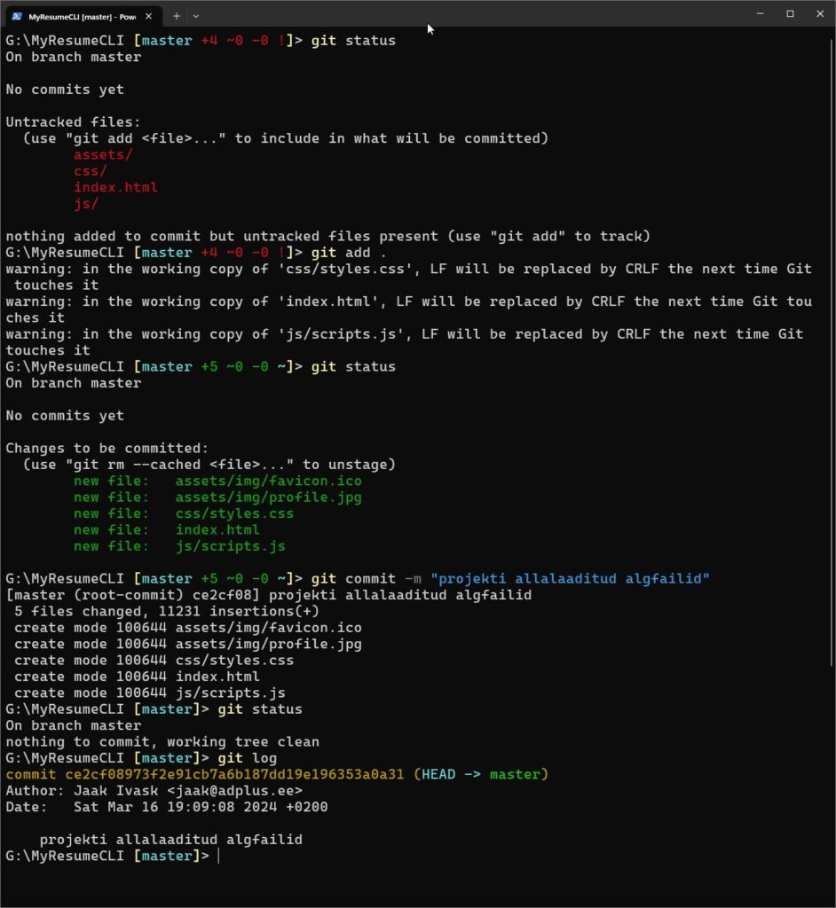 Siit alates hakkab sisuline töö CV projektiga, mille lõpp tulemuseks on soovi korral avalikult vaadatav isiklik CV leht GitHub pages keskkonnas.